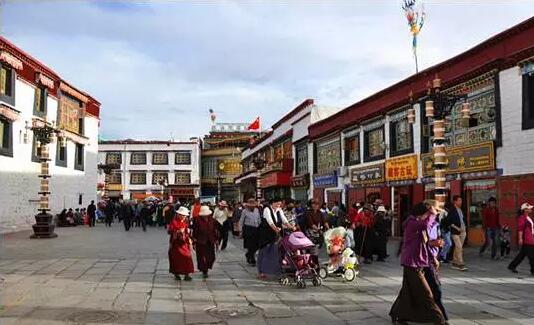 这里是西藏著名的商业中心,各式各样的民族手工艺品的历史和现代清晰的记载了这个地方,是游客购物的好去处。这里还是藏传佛教信徒转经的最主要的线路,每天都有磕着三步等身长头的人来到这里。他们到大昭寺前朝拜佛祖,在光滑发亮的石块道上投下了一道道长长短短的影子。