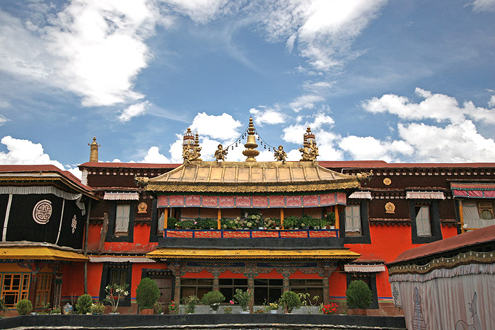 大昭寺是座土木结构的寺庙,主殿三层,殿顶覆盖着西藏独具一格的金顶,阳光下浮光耀金,光彩夺目。寺前终日香火缭绕,信徒们虔诚的叩拜在门前的青石地板上留下了等身长头的深深印痕。万盏酥油灯长明,记录着朝圣者永不止息的足迹,也留下了岁月的永恒。一千多年的历史,一千多年的香火,延续了一个流传了一千多年的故事。