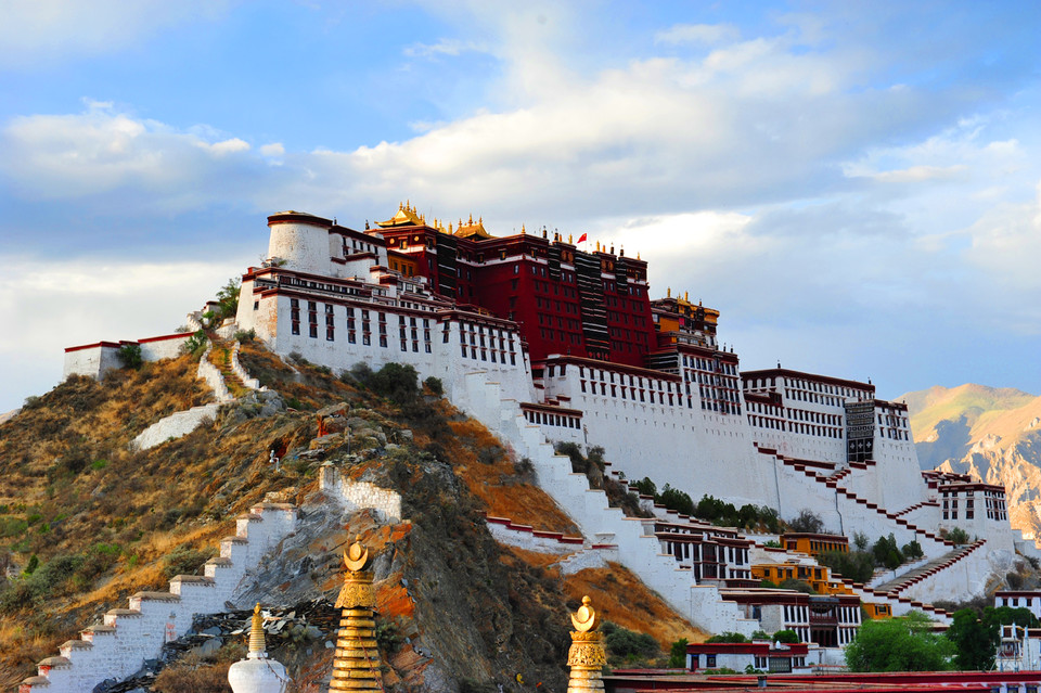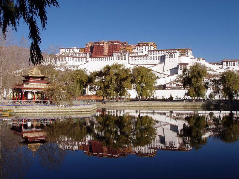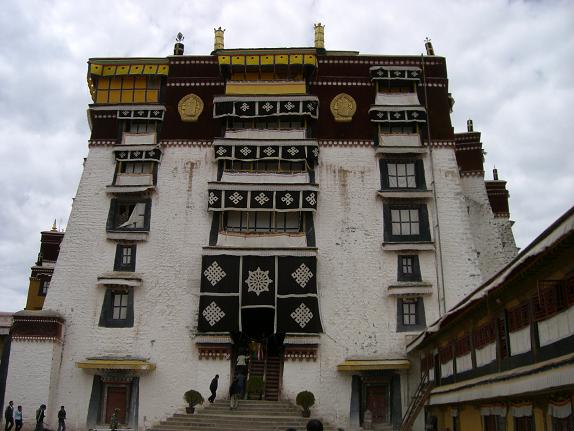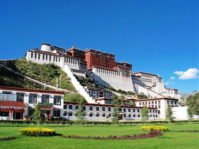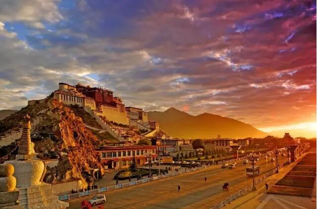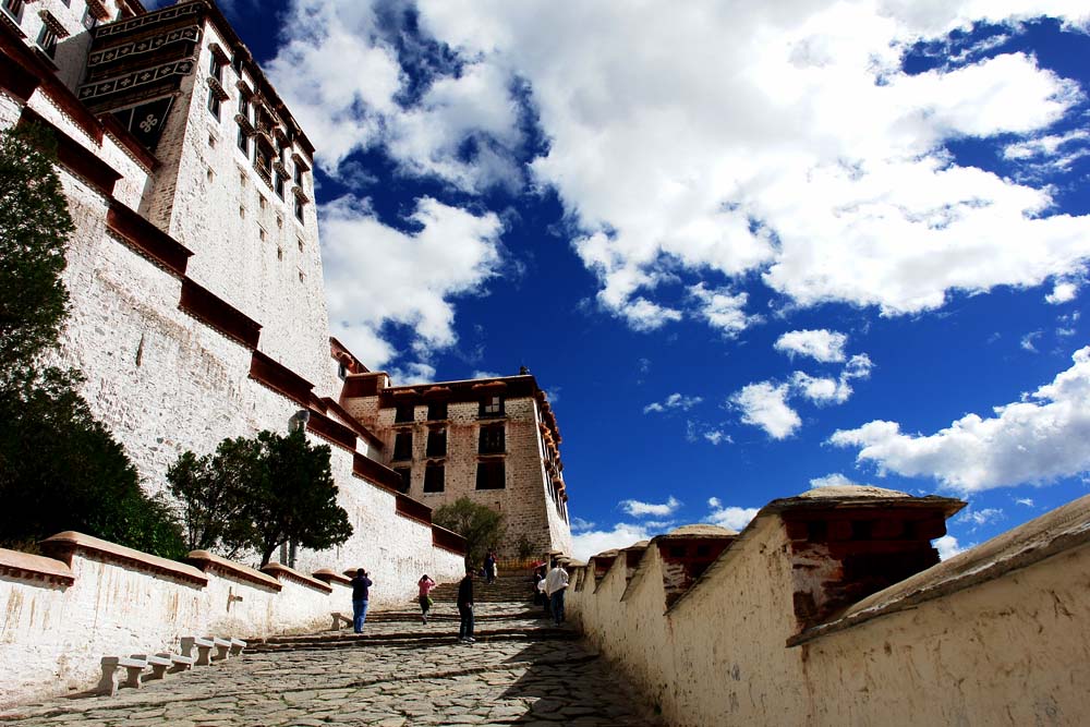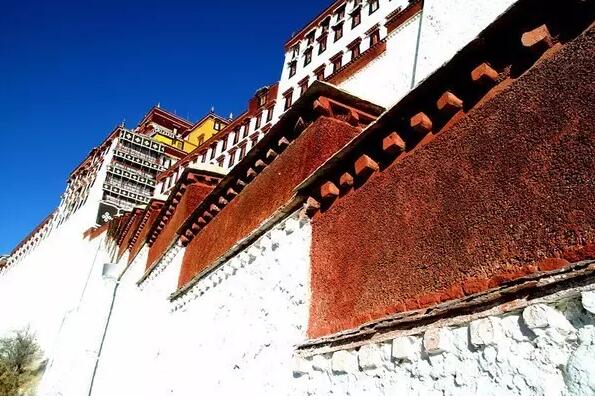 比血还深浓的藏红花色,云一般纯净的白色,珍贵神秘的黑牦牛色装饰着宫闱殿墙,层层叠叠,错错落落,一如展开的画轴,叙述着西藏独特的历史、独特的文明,它又如一部精美的书简,随性地搁在拉萨的山脉间,经受日月的检阅和风雨的洗礼。