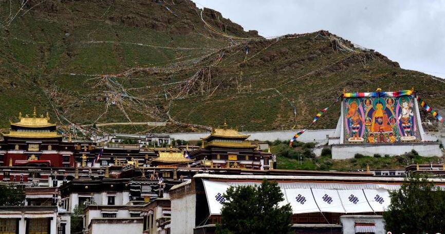 7月20日,扎什伦布寺展出的强巴佛巨幅唐卡佛像。