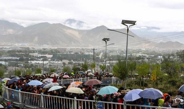 从凌晨开始至下午两点,数十万各地信徒蜂拥登上哲蚌寺后山朝拜。人最多时,排起了长达三四公里的长队,到达展佛地需要两个多小时。即便当天频频下雨,也未能阻挡众人的步伐。