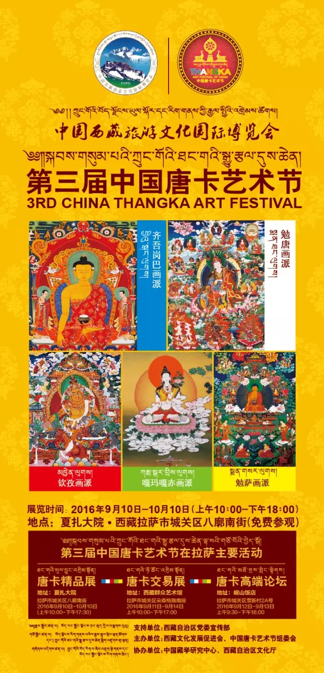 第三届中国唐卡艺术节由“中国唐卡艺术节精品展”、“中国唐卡艺术节作品交易展”、“中国唐卡艺术节高端论坛”等活动组成,将于9月10日至10月10日期间分别在夏扎大院、自治区群艺馆及岷山饭店等地举行。其中,“中国唐卡艺术节精品展”持续时间最长,将于9月10日至10月10日期间在拉萨八廓街夏扎大院展出,每天10:00至18:00时对外免费开放。