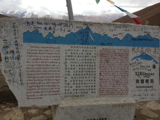 在珠峰大本营纪念碑上,黑色笔迹的“涂鸦”甚至盖过了原先红色标注的“珠穆朗玛峰大本营”等字样。这些“涂鸦”有的是人名,有的是短句,还有图画等,近看格外刺眼。