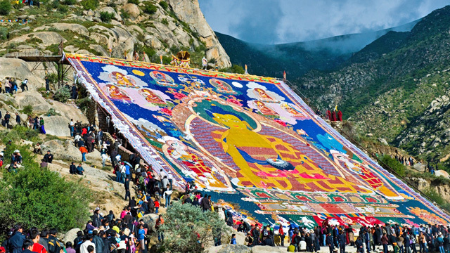 哲蚌寺展佛晒佛:展佛是雪顿节第一天(藏历六月三十日(2019年公历8月30日))举办的盛大仪式。当天数以万计的国内外游客,当地藏民纷纷来此观赏佛像