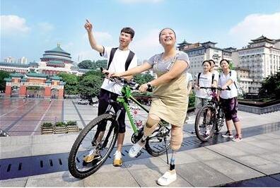 骑在山地车上一路飞奔,高莹身后撒下一串银铃般的笑声:“这车太好骑了呀!比我的车好骑多了!”她甜甜的微笑,也让不少人停下了匆忙的脚步,注视着她用义肢蹬动踏板的身影。用义肢骑车,“小腿”使不上劲,只能依靠大腿的力量,十几分钟后就要下车休息…