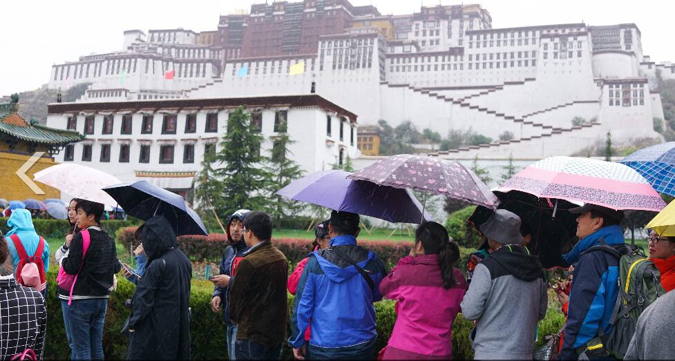 6月13日,游客在雨中排队等待进入布达拉宫参观。 进入6月以来,西藏旅游市场逐步进入旺季,各旅游景点的国内外游客明显增多。