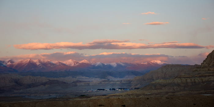 忙完了日出后面就没什么计划,回到屋里坐了会儿,发现屋里实在冷得受不了,就和朋友一人搬了把椅子坐到旅馆的前面晒太阳。虽然风很大,但太阳还是带来了不少温暖,眯着眼看着远处的唐古拉山脉的雪峰群,时间好像凝固了。人在旅途最难得的好像就是能够有充裕的时间,没想到大老远跑到了西藏却有了这样难得的享受,面前是美景,脑袋里空空,低头看着地上自己的影子在椅子的一边从长变短然后又跑到另一边再从短变长,发发呆原来也是件很惬意的事。