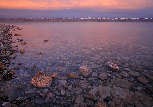 也许因为寒冷,也许因为高反,大家都选择了赖在被窝里,清晨的湖边完全属于了我和同去的朋友。找到了湖边的一块石头之后我就基本没有再动地方。天空逐渐发亮,慢从紫红,到金黄,到天蓝,最后到远处的唐古拉山脉和我面前的这块石头也都慢慢被点亮,真给人一种坐看云起的感觉。拍风景的时候经常会觉得上帝在和自己开玩笑,每次按下快门之后就发现景色似乎变得更加漂亮了,刚拍的一张好像完全没有了意义,但谁又敢一直不拍而等待着那最美的瞬间呢?逐渐岸边拍摄的人也越来越多,可能看我一直猫在同一个地方,几个人路过我这儿时还关心地问我是否是高反起不来了。