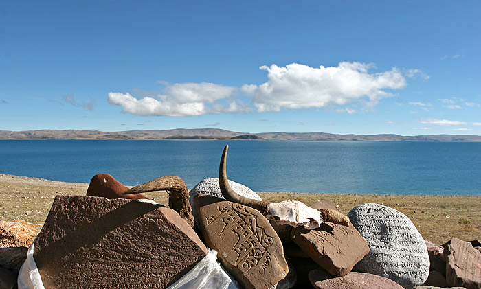 来西藏之前不止一个人告诉我他她们看到纳木措的时候都那么自然地就哭了,有些人甚至是双膝跪地嚎啕大哭。我不想帮着继续来制造这种神秘感,老实地说,我反倒有些奇怪自己的镇静,怀疑自己神经的敏感,难道是期望太多了?纳木措并没有带给我足够的视觉冲击和震撼,这一程真正打动我的却是路上每个山口都布满的经幡,在风中传播着人们的祈福。虽然我所看到的还只停留在摄影的层面上,关注的更多还是是色彩和形状,但闭上眼用心画出已经深深刻划在记忆里的那蓝天和白云,完全放松,就让四周那忽啦啦经幡被风触摸着的声音很自然地充满我,仿佛感觉自己的灵魂也得到了一丝升华。