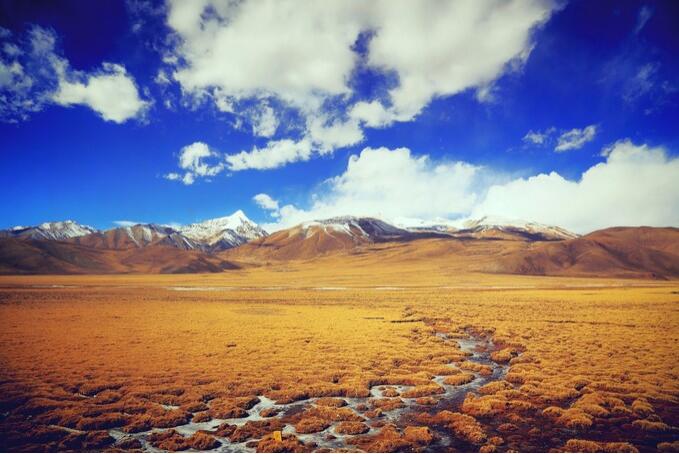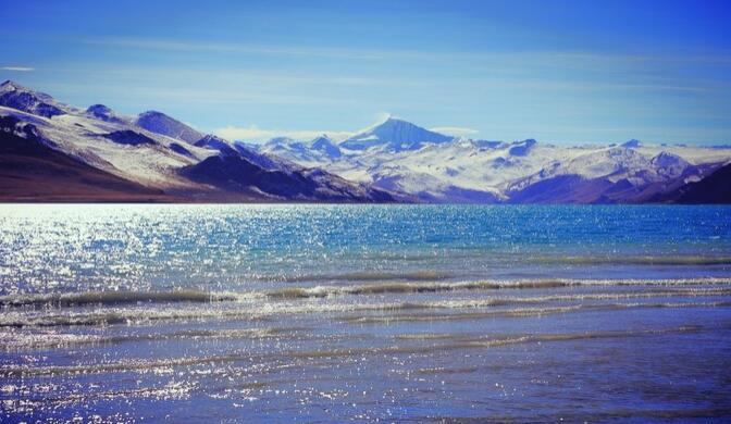 远处的雪峰是拉轨岗日山的主峰——宁金抗沙峰,意思是“夜叉神住在高贵的雪山上”。这座雪峰高达7206米,是后藏地区最重要的神山,也是西藏传统四大神山之一。另外,世界上海拔最高的抽水蓄能电站——羊湖电站即坐落于此。拉轨岗日山是条延绵约360多千米的山脉,它把雅鲁藏布江和羊卓雍措隔开。