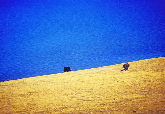 羊湖的水异常清澈,而且能看到明显的色彩分层,很是其妙。湖岸边有藏民牵着牦牛或藏獒合影,通常是10元钱随便拍。另外羊湖岸边有一块刻有海拔高度的石碑,在旺季拍照是要收费的,由于现在是淡季,也就没人收钱了。
