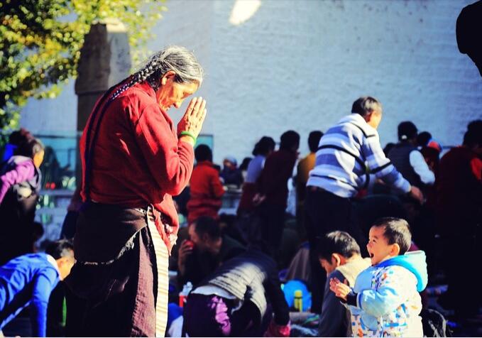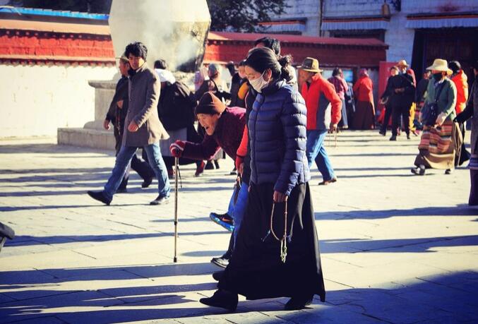 一早加入八廓街转经的人群,顺时针围着大昭寺转经行走,人们手中持着转经筒或念珠,口中念诵着佛经,人群就这样流动,置身其中,自有神意。