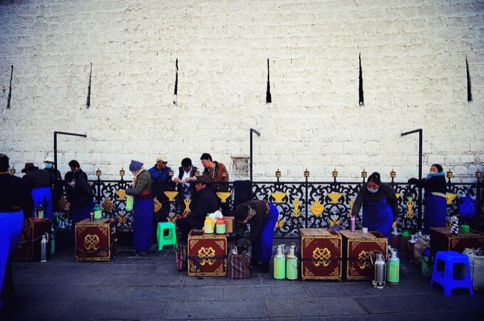 藏民们有喝甜茶和酥油茶的习惯,尤其早上天气寒冷,在排队的围廊外面,就有很多卖茶水的,几毛钱一杯,非常便宜。