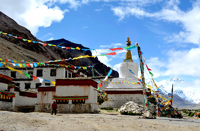 在营地附近的世界上海拔最高寺庙—绒布寺(门票自费)南望,是举世公认仰望观赏珠峰和拍摄珠峰的最佳位置。寺庙白塔耸立,五彩经幡翻飞,在此您将与世界最高峰珠穆朗玛峰共舞,有幸还可以看到有如生命之火般飘荡的珠峰旗云。珠峰行程最远只能到达绒布寺附近的【珠穆朗玛峰高程测量纪念碑】打卡点,实际状况依景区公告为主。