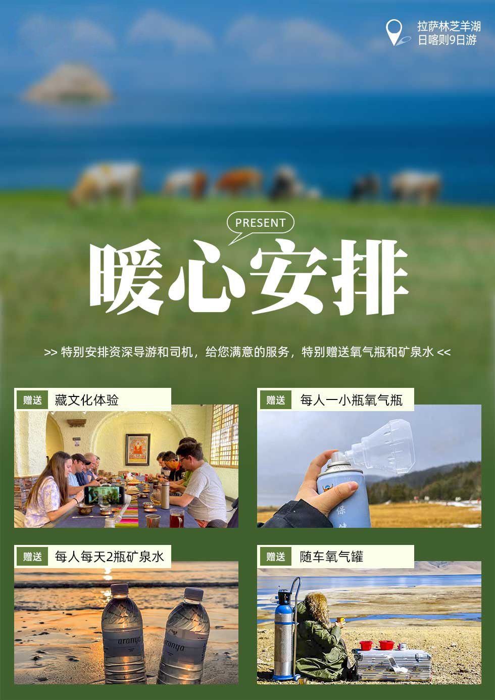 附加服务:赠送每人1小瓶便携式氧气,赠送每人每天2小瓶矿泉水(300ml装),随车提供备用应急医用氧气罐一瓶(4L装)。