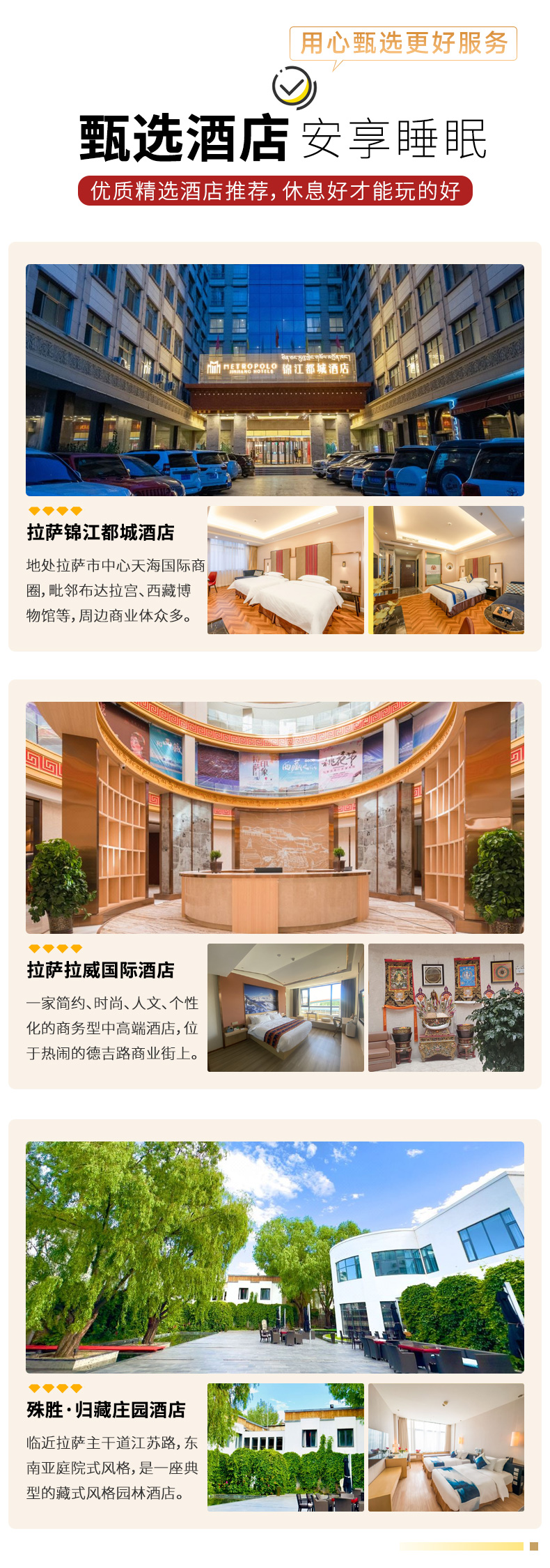 酒店安排:拉萨4钻/4星舒适型酒店标准间;拉萨之外地区为经济型酒店标准间;如需升级酒店,欢迎您联系我们。