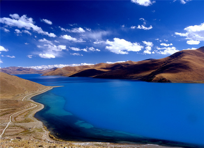 羊卓雍错藏语为“碧玉湖”,是喜马拉雅山北麓最大的内陆湖泊,西藏的三大圣湖之一,湖岛上,黄鸭、灰鸭、黑颈鹤、天鹅成群接队,时起时落;远处山峰白灰银甲,湖光山色,交相辉映,无比妖娆。难怪生活在湖边的人们,用“天上的仙境,人间的羊卓;天上的繁星,湖畔的羊群”来赞美她。湛蓝的湖水与远方的雪山连为一体,加上两岸各色的山脉、极具特色的藏民族村落、遍地的牛羊,一路走来,心旷神怡。
